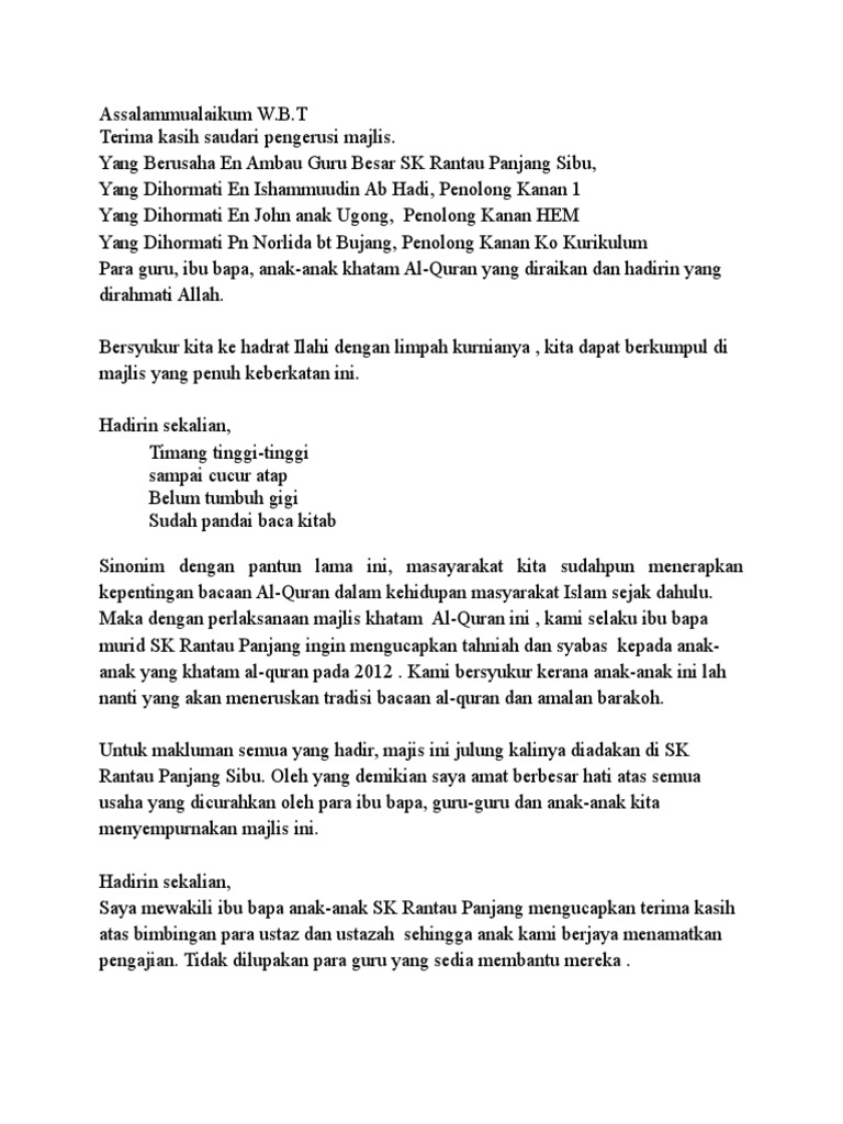Teks Ucapan Untuk Majlis Khatam Al Quran Pdf from imgv2-1-f.scribdassets.com Maybe you would like to learn more about one of these? Check spelling or type a new query. We did not find results for: Ucapan syukur khatam al quran.