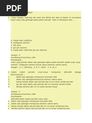 Prediksi Ujian Nasional 2008 Viewunsur Oksigen Belerang Dan Selen Bila Dilihat Dari Data Di Bawah Ini Merupakan Unsur Unsur Satu Golongan Pada Sistem Periodik Unsur Oksigen Belerang Doc Document from reader015.staticloud.net Hasil ini ditunjukan oleh …. Dalam hal ini merupakan zat tunggal yang secara kimia tidak dapat diuraikan lagi menjadi zat lain yang lebih sederhana. Misalnya, unsur belerang dengan unsur oksigen dapat membentuk senyawa so2 dan so3. Di dalam golongan ini kesamaan horizontalnya lebih besar daripada vertikalnya dan gambaran mengenai sifat unsur ini didasarkan pada golongan horizontal setiap tiga unsur, yang disebut triad. Dalam sistem periodik unsur unsur mempunyai sifat sifat sebagai berikut kecuali. Hasil ini ditunjukan oleh …. Belerang, dalam bentuk aslinya, adalah sebuah zat padat kristalin kuning. Pembuatan kalium sulfat dari belerang dan ekstrak abu yang dioksidasi dengan udara dilakukan dalam suatu kolom berpenghalang miring pada tekanan 1 atm dan suhu 95 0 c.